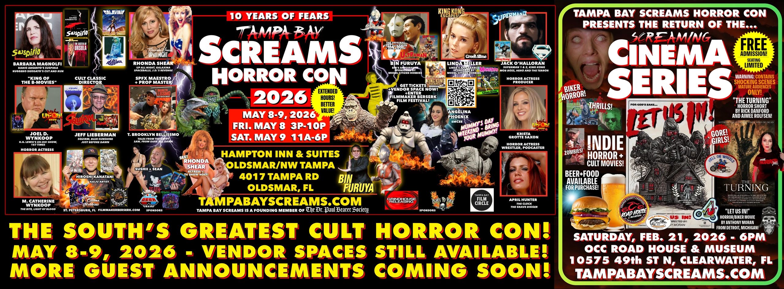 Join us for Tampa Bay Screams Horror Convention 2026, celebrating its 10th anniversary with cult movie celebrities, vendors, and a film festival.